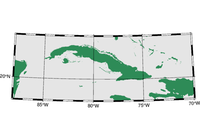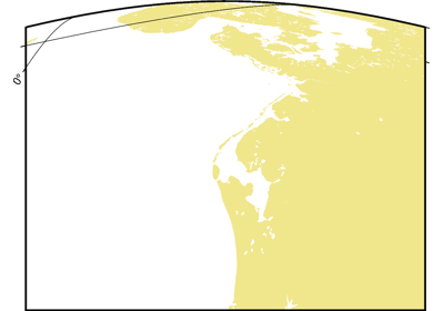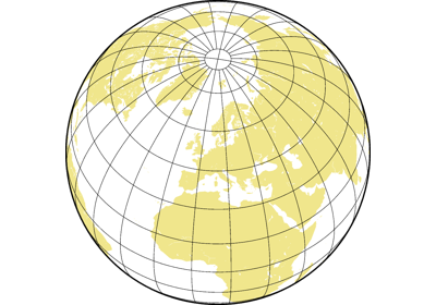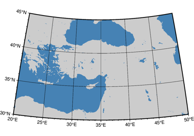 PyGMT supports many map projections; see GMT Map Projections for an overview. Use the projection parameter to specify which one you want to use in all plotting methods. The projection is specified by a one-letter code along with (sometimes optional) reference longitude and latitude and the width of the map (for example, Alon0/lat0[/horizon]/width). The map height is determined based on the region and projection.